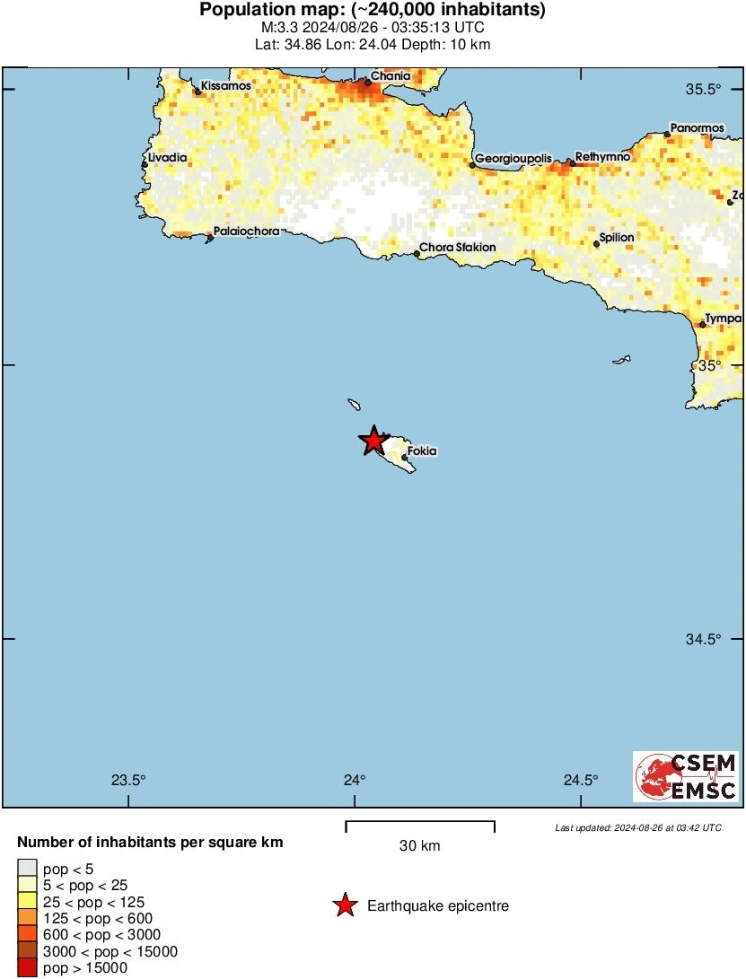 Σεισμός 3,3 βαθμών της κλίμακας Ρίχτερ, σύμφωνα με την αυτόματη λύση του Ευρωπαϊκού – Μεσογειακού Σεισμολογικού Κέντρου (EMSC), σημειώθηκε το πρωί της Δευτέρας (26/8) στις 06:35, στις ακτές της Γαύδου.