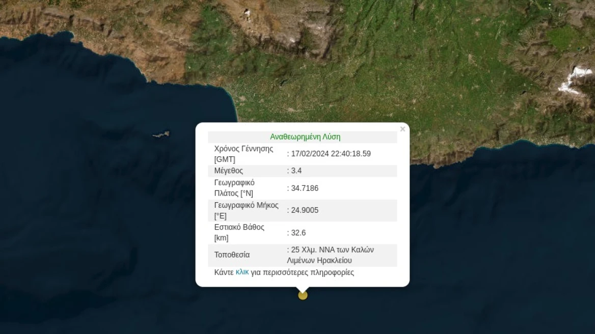Στις 00:40 τα ξημερώματα της Κυριακής (18/2), σημειώθηκε σεισμική δόνηση μεγέθους 3,4 βαθμών της κλίμακας Ρίχτερ ανοιχτά της Κρήτης.