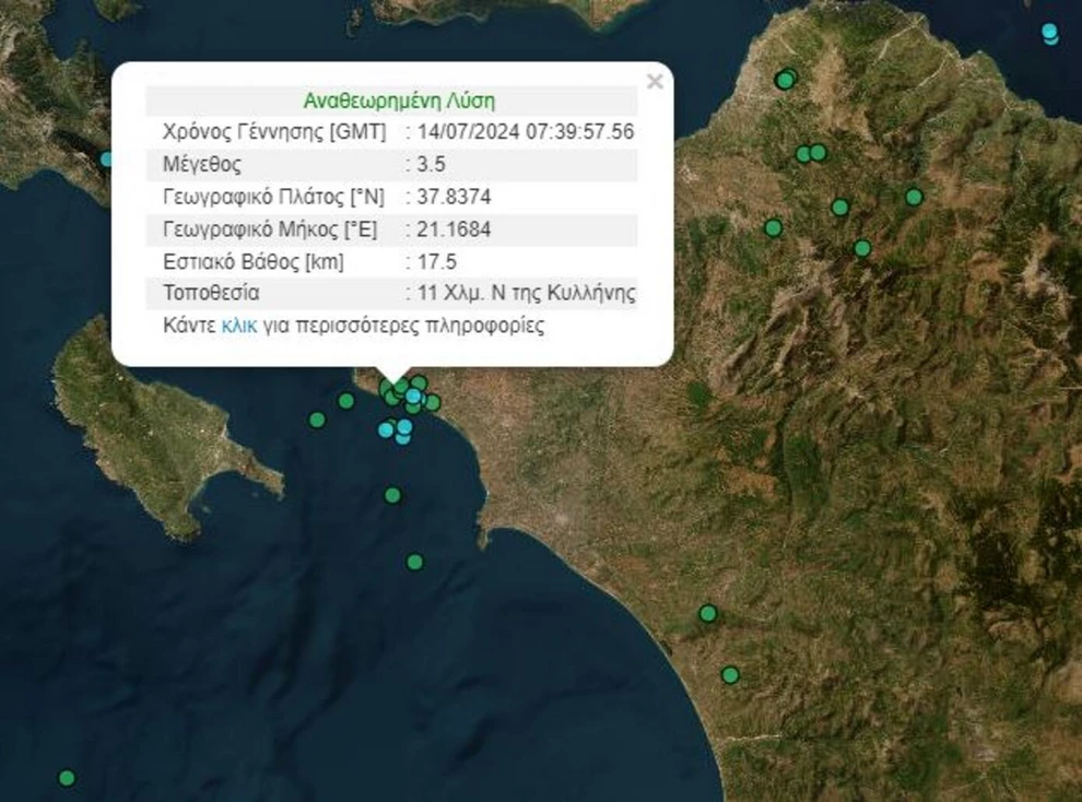 Σεισμική δόνηση μεγέθους 3,5 βαθμών της κλίμακας Ρίχτερ καταγράφηκε σήμερα (14/7) το πρωί κοντά στην Κυλλήνη και έγινε αισθητός σε περιοχές της Ηλείας και της Αχαΐας.