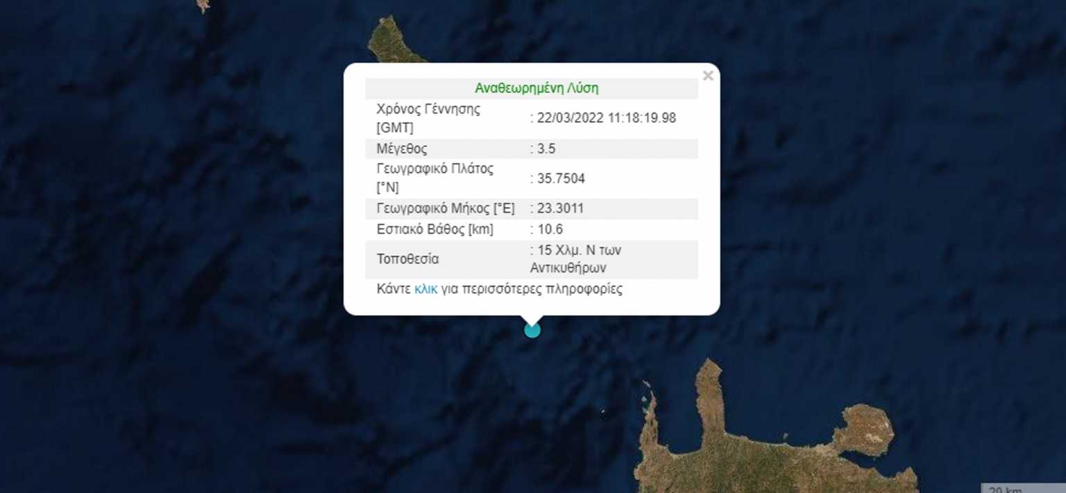 Σύμφωνα με την αυτόματη λύση του Γεωδυναμικού Ινστιτούτου του Εθνικού Αστεροσκοπείου Αθηνών, 18΄ λεπτά μετά τη 1 το μεσημέρι της Τρίτης, σημειώθηκε σεισμός μεγέθους 3,5 βαθμών της κλίμακας Ρίχτερ στα Αντικύθηρα.