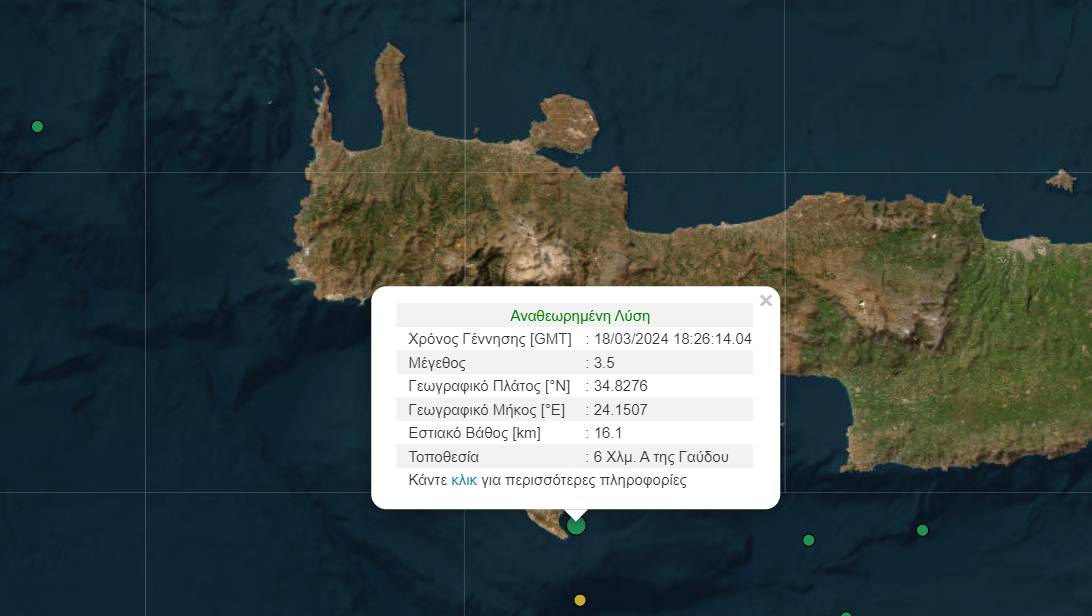 Σεισμική δόνηση 3,5 Ρίχτερ καταγράφηκε σήμερα (18/3) στη Γαύδο.
