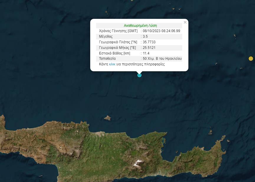 Σεισμική δόνηση μεγέθους 3,5 βαθμών της κλίμακας Ρίχτερ σημειώθηκε το πρωί της Κυριακής 8 Οκτωβρίου 50 χιλιόμετρα βόρεια του Ηρακλείου, σύμφωνα με την αναθεωρημένη λύση του Γεωδυναμικού Ινστιτούτου.