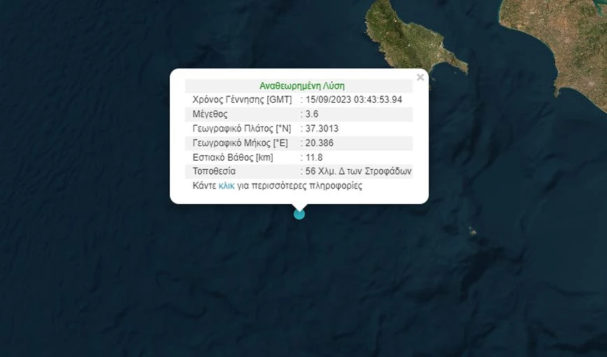 Σύμφωνα με το Γεωδυναμικό Ινστιτούτο, το επίκεντρο του σεισμού εντοπίζεται σε θαλάσσια περιοχή 56 χιλιόμετρα δυτικά των Στροφάδων στη Ζάκυνθο, ενώ το εστιακό βάθος εκτιμάται στα 11,8 χιλιόμετρα.