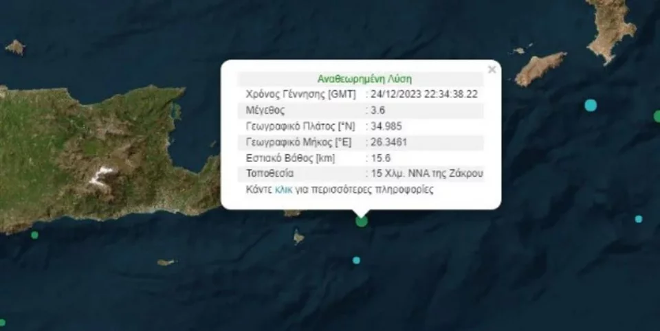 Σύμφωνα με την αναθεωρημένη λύση του Γεωδυναμικού Ινστιτούτου του Αστεροσκοπείου Αθηνών δίνει το σεισμό στα 3,6 Ρίχτερ, με εστιακό βάθος τα 15,9 χλμ., και επίκεντρο τα 15 χλμ. νότια – νοτιοανατολικά της Ζάκρου.