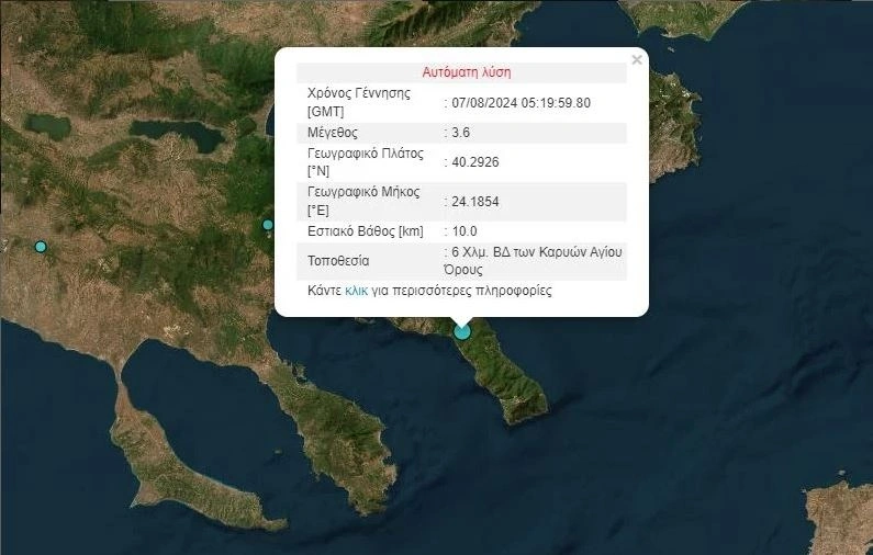 Το επίκεντρο του σεισμού εντοπίζεται 6 χλμ βορειοδυτικά των Καρυών Αγίου Όρους ενώ το εστιακό βάθος υπολογίζεται στα 10 χλμ.