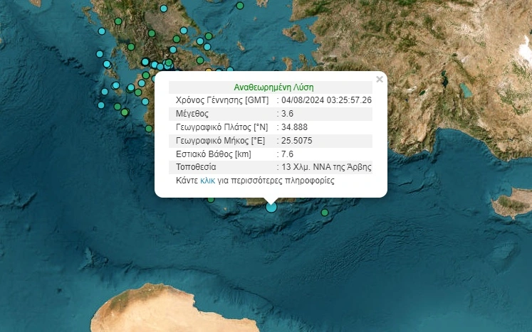 Σύμφωνα με το Γεωδυναμικό Ινστιτούτο, η δόνηση είχε επίκεντρο 13 χιλιόμετρα Νότια – Νοτιοανατολικά της Άρβης.