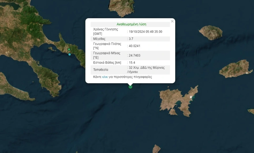 Σύμφωνα με το Γεωδυναμικό Ινστιτούτο, το επίκεντρο της δόνησης ήταν στα 32 χιλιόμετρα δυτικά – βορειοδυτικά της Μύρινας, ενώ το εστιακό βάθος καταγράφηκε στα 15,4 χιλιόμετρα.