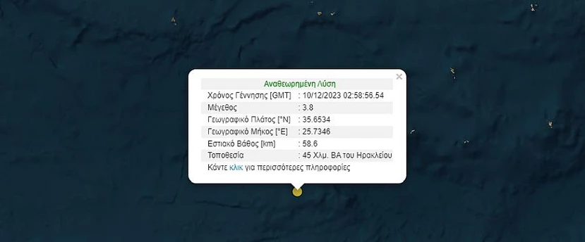 Το επίκεντρο του σεισμού εντοπίζεται 45 χιλιόμετρα βορειοανατολικά της Ηρακλείου και είχε εστιακό βάθος στα 58,6 χιλιόμετρα.