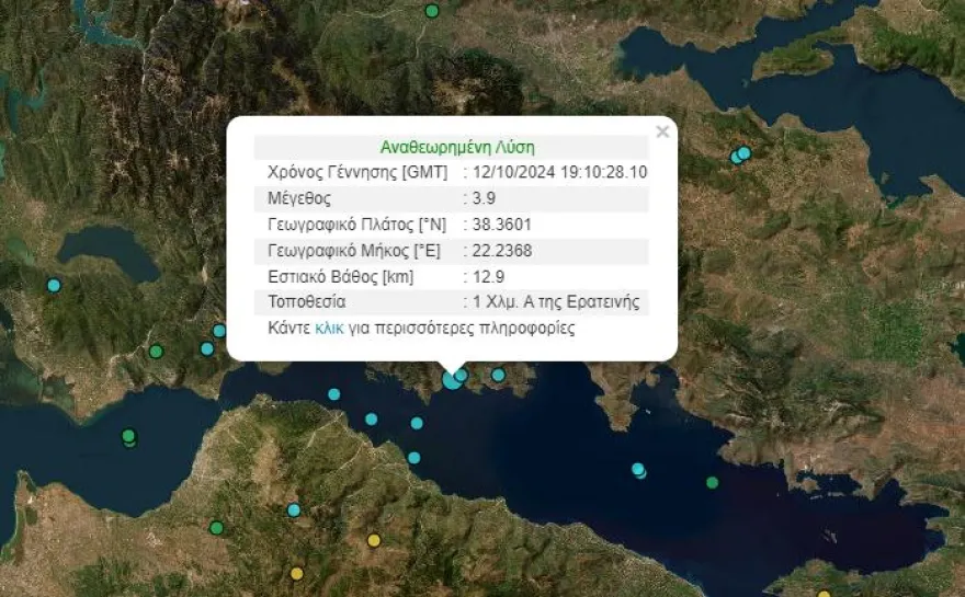 Ειδικότερα, σύμφωνα με την αναθεωρημένη λύση του Γεωδυναμικού Ινστιτούτου το επίκεντρο του σεισμού εντοπίζεται 1 χιλιόμετρο ανατολικά της Ερατεινής με εστιακό βάθος 12,9 χιλιόμετρα.