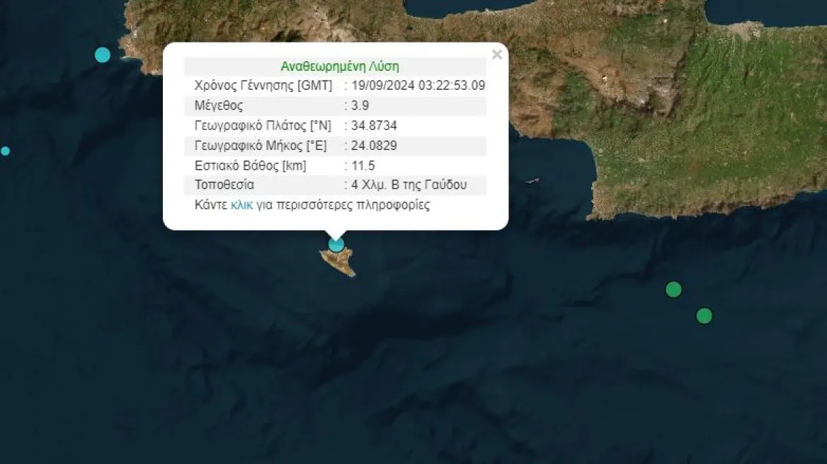 Σεισμική δόνηση μεγέθους 3,9 Ρίχτερ σημειώθηκε τα ξημερώματα της Πέμπτης στη Γαύδο.