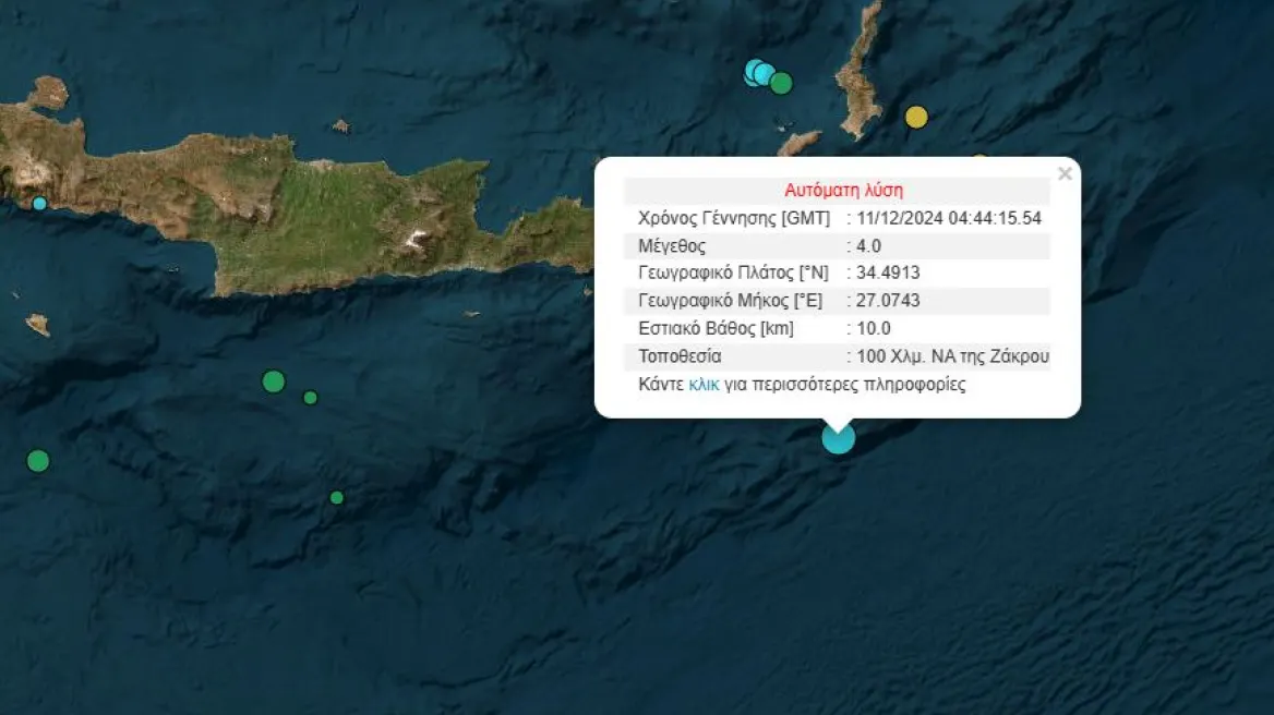 Σύμφωνα με την αυτόματη λύση του Γεωδυναμικού Ινστιτούτου, το επίκεντρο του σεισμού εντοπίζεται 100 χλμ. νοτιοανατολικά της Ζάκρου.