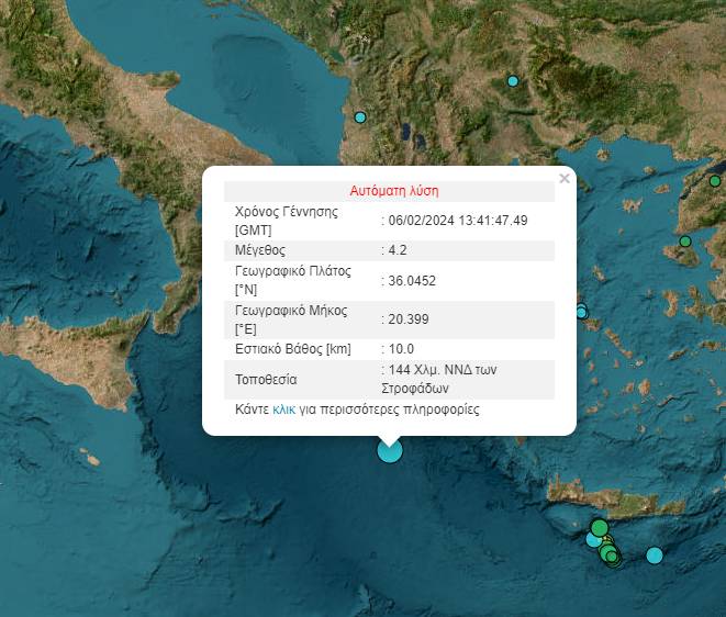 Σύμφωνα με την Αυτόματη Λύση του Γεωδυναμικού Ινστιτούτου το επίκεντρο του σεισμού εντοπίζεται 144 χιλιόμετρα νοτιοδυτικά των Στροφάδων.