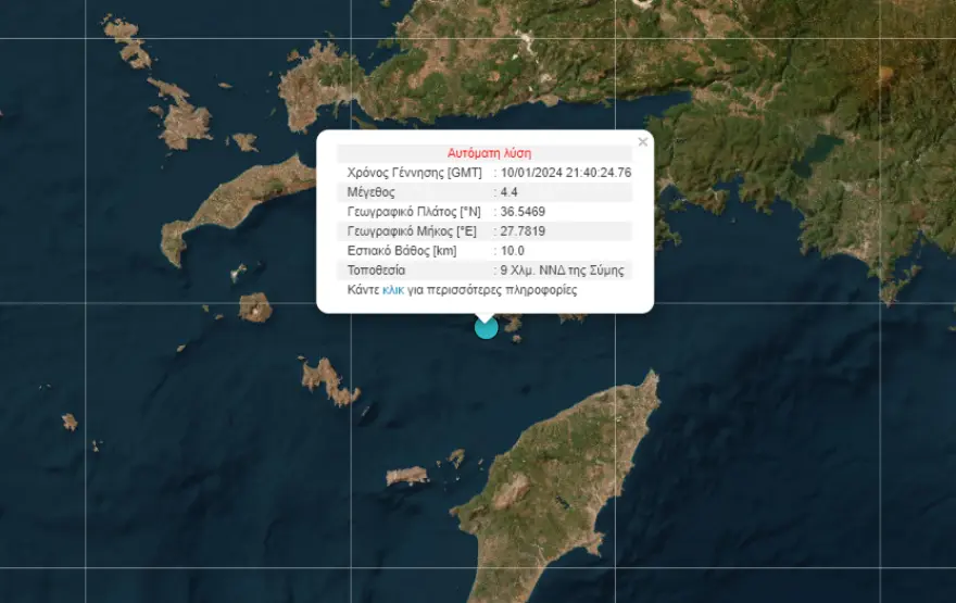 Σεισμική δόνηση 4,4 βαθμών της κλίμακας Ρίχτερ ταρακούνησε τη Σύμη το βράδυ της Τετάρτης (10/01, 23:40:24).