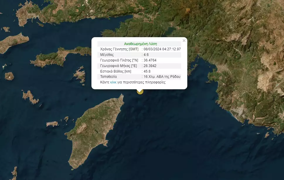 Η ανάλυση του Γεωδυναμικού Ινστιτούτου αναφέρει πως ο σεισμός σημειώθηκε στη θαλάσσια περιοχή βορειανατολικά της Ρόδου και ήταν μεγέθους 4,6 Ρίχτερ. Το εστιακό βάθος ήταν 45,8 χιλιόμετρα.