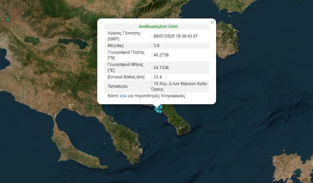 Σεισμική δόνηση μεγέθους 3,6 βαθμών της κλίμακας Ρίχτερ σημειώθηκε λίγο πριν τις 11 το βράδυ της Τρίτης (08/07), με επίκεντρο την περιοχή του Αγίου Όρους στη Χαλκιδική.