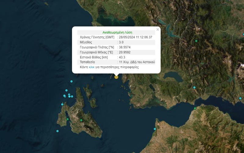 Σεισμός μεγέθους 3 βαθμών της κλίμακας ρίχτερ σημειώθηκε στη θαλάσσια περιοχή βορειοδυτικά του Αστακού το μεσημέρι της Τρίτης (28/5).