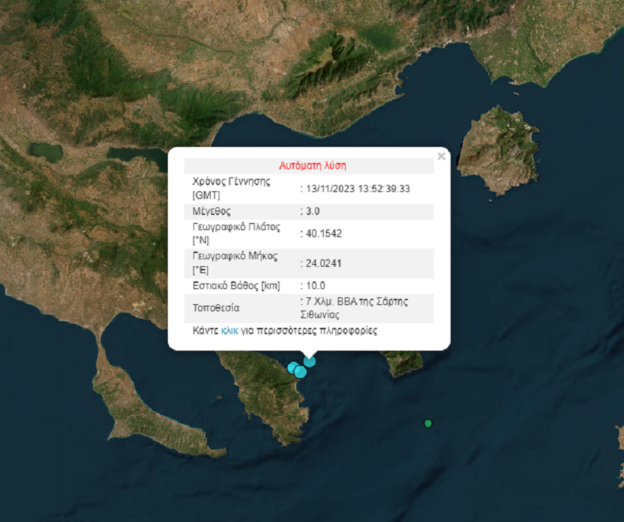 Λίγο πριν τις 4 το μεσημέρι της Δευτέρας (13/11), σημειώθηκε σεισμός μεγέθους 3 βαθμών της κλίμακας Ρίχτερ στη Χαλκιδική, σύμφωνα με την αυτόματη μέτρηση από το Γεωδυναμικό Ινστιτούτο του Αστεροσκοπείου Αθηνών.