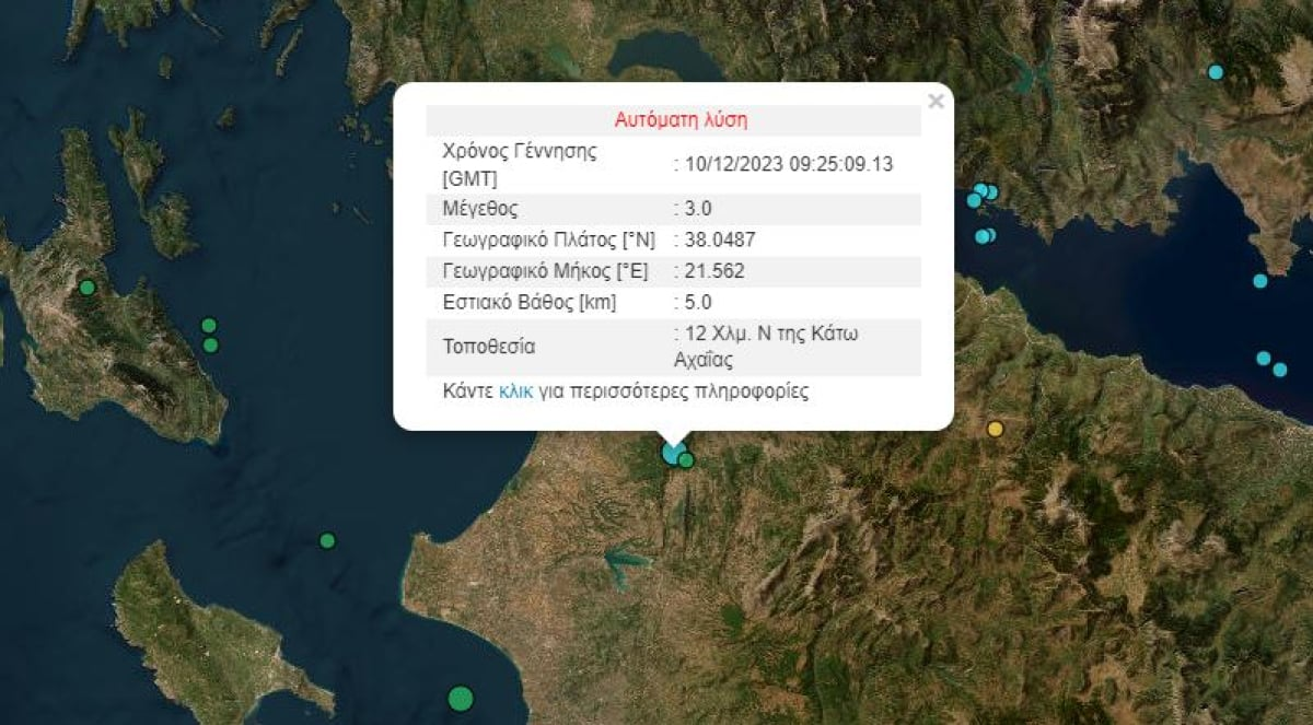 Ειδικότερα, η σεισμική δόνηση καταγράφηκε 12 χλμ. νότια της Κάτω Αχαΐας, σύμφωνα με το Γεωδυναμικό Ινστιτούτο και το εστιακό βάθος εντοπίζεται στα 5 χλμ.
