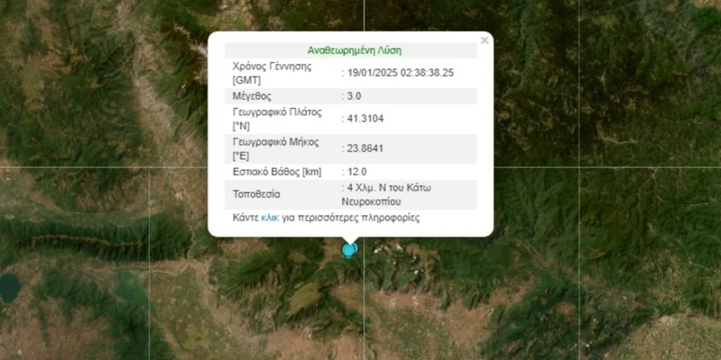 Σύμφωνα με την αναθεωρημένη λύση του Γεωδυναμικού Ινστιτούτου, η δόνηση καταγράφηκε στα 4 χιλιόμετρα νότια του Κάτω Νευροκοπίου.