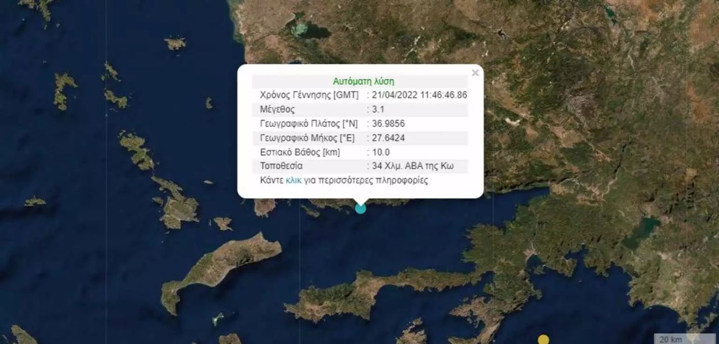 Σύμφωνα με το Γεωδυναμικό Ινστιτούτο του Εθνικού Αστεροσκοπείου Αθηνών, σεισμός 3,1 Ρίχτερ σημειώθηκε στις 13:45′ λεπτά της Μεγάλης Πέμπτης στις τουρκικές ακτές απέναντι από την Κω.