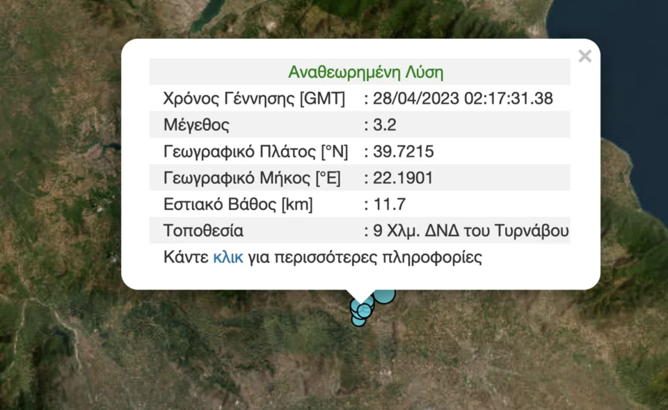 Συγκεκριμένα στις 5.17 π.μ. καταγράφηκε, σύμφωνα με το Γεωδυναμικό Ινστιτούτο του Εθνικού Αστεροσκοπείου Αθηνών, σεισμική δόνηση μεγέθους 3,2 βαθμών της κλίμακας Ρίχτερ. Το επίκεντρο εντοπίστηκε 9 χλμ. ΔΝΔ του Τυρνάβου, ενώ το εστιακό βάθος ήταν στα 11,7 χλμ.