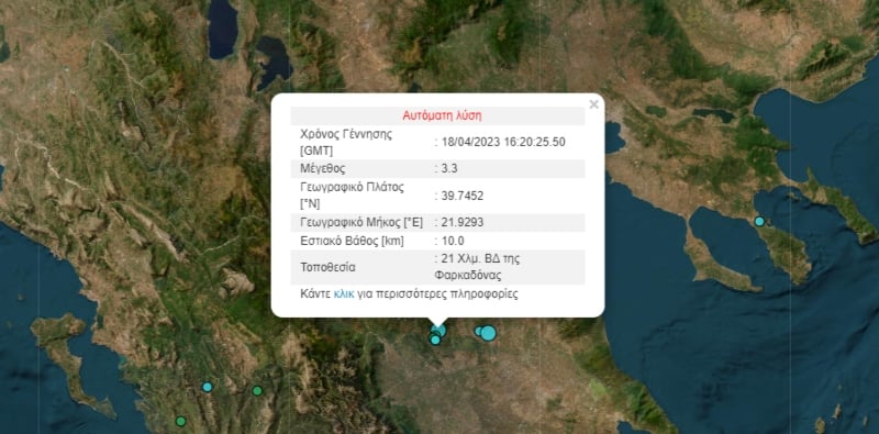 Σεισμός σημειώθηκε στις 19:20 το απόγευμα της Τρίτης (18/4) κοντά στη Φαρκαδόνα Τρικάλων.