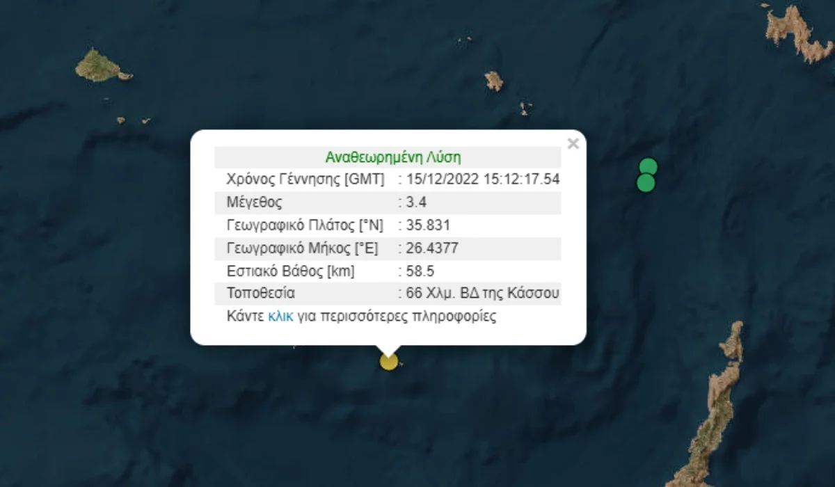 Σεισμός καταγράφηκε στις 17:12 την Πέμπτη (15/12) 66 χιλιόμετρα βορειοδυτικά της Κάσου.