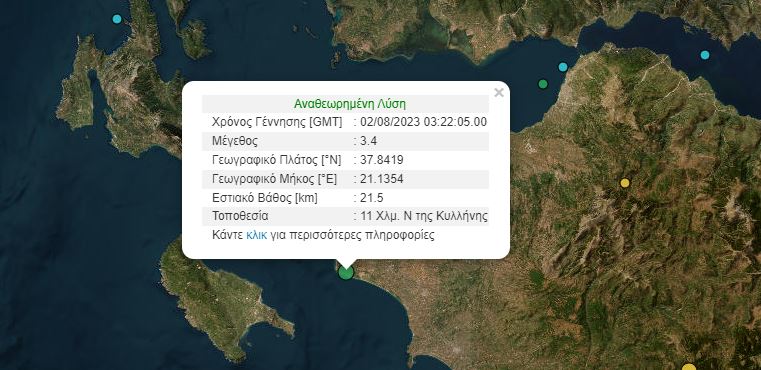 Σεισμός μεγέθους 3,4 βαθμών της κλίμακας Ρίχτερ σημειώθηκε το πρωί της Τετάρτης 2 Αυγούστου στην Κυλλήνη, σύμφωνα με το Γεωδυναμικό Ινστιτούτο.