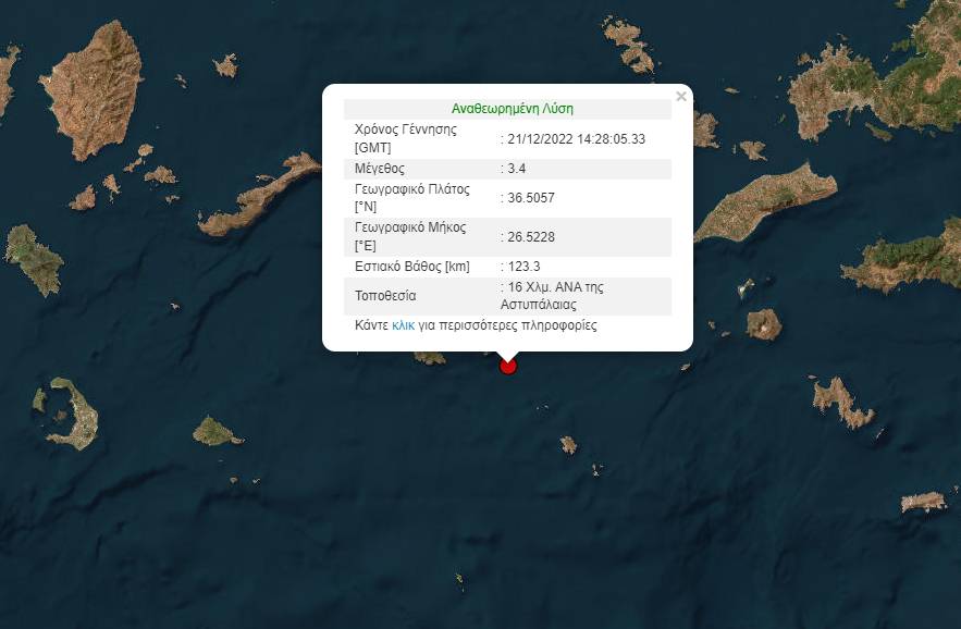 Σεισμός σημειώθηκε το μεσημέρι της Τετάρτης (21/12) στη θαλάσσια περιοχή ανατολικά – νοτιοανατολικά της Αστυπάλαιας.