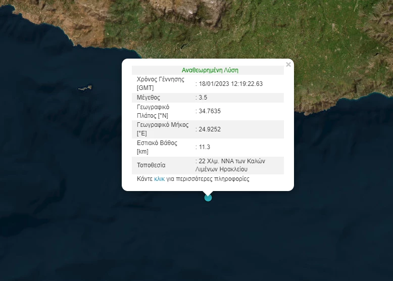 Σεισμική δόνηση 3,5 βαθμών της Κλίμακας Ρίχτερ σημειώθηκε στις 14:19 της Τετάρτης (18/1) στα ανοιχτά της Κρήτης, νότια του νησιού.