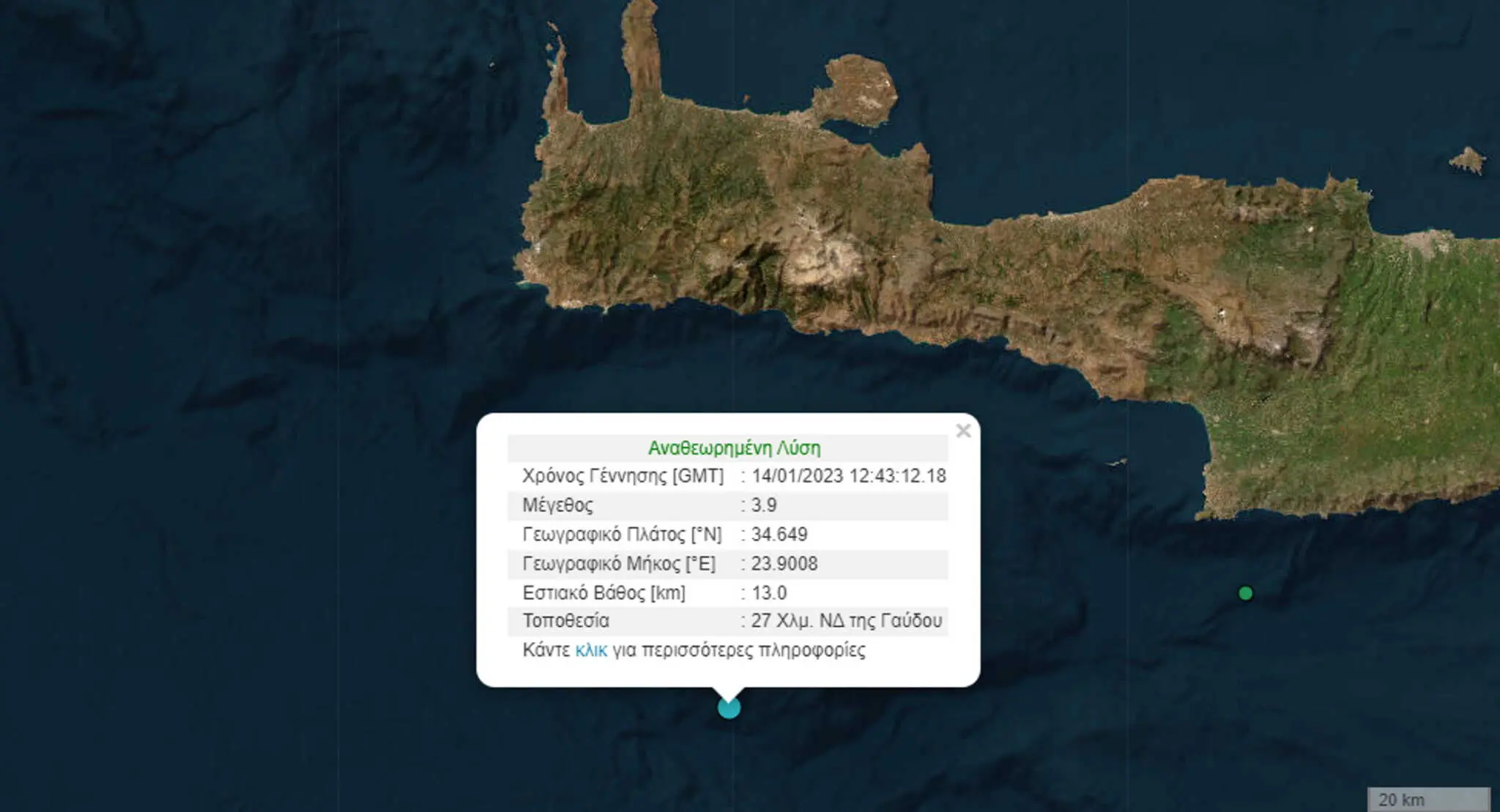 3️⃣9️⃣ 🟢 M 3.9, 14/01 14:43, βάθος 13 χλμ, 25 χλμ ΝΔ από Γαύδος.