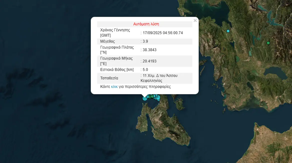 Το πρωί της Τετάρτης (17/9) σημειώθηκε σεισμός μεγέθους 3,9 βαθμών της κλίμακας Ρίχτερ στην Κεφαλονιά.