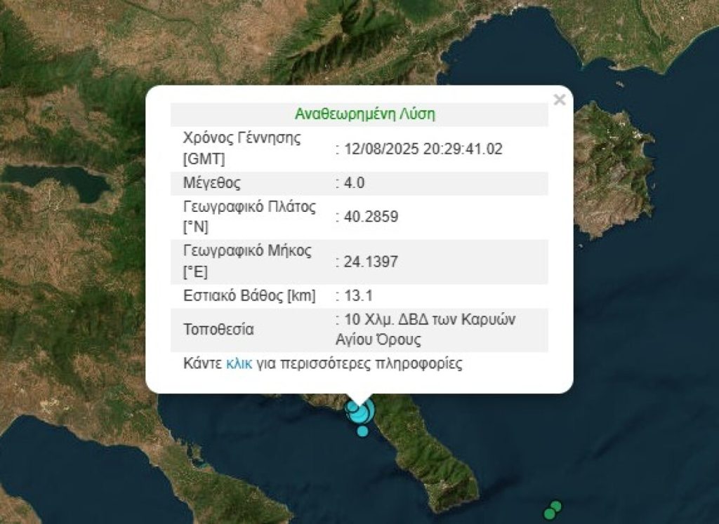 Σεισμός μεγέθους 4 Ρίχτερ έγινε στο Άγιο Όρος λίγο πριν τις 23:30 το βράδυ της Τρίτης (12/08).
