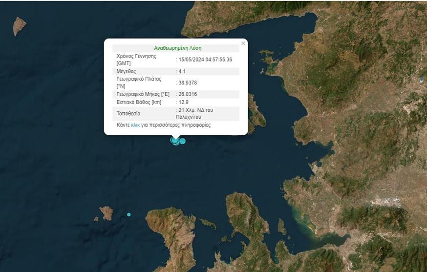 Σεισμός μεγέθους 4,1 βαθμών της κλίμακας Ρίχτερ σημειώθηκε στις 07:57 το πρωί της Τετάρτης (15/5) ανοιχτά της Μυτιλήνης.