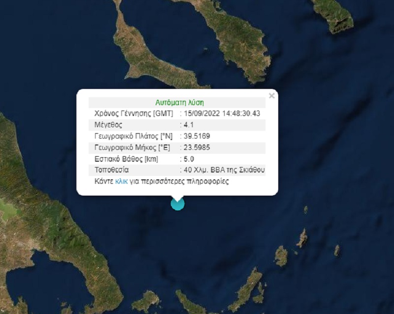 Σύμφωνα με το ευρωμεσογειακό ινστιτούτο, ο σεισμός στη Σκιάθο είχε ένταση 4,7 Ρίχτερ και το επίκεντρο εντοπίζεται 61 χιλιόμετρο ανατολικά του Βόλου.