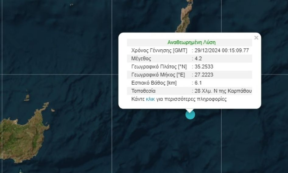 Στις 02:15 τα ξημερώματα της Κυριακής (29/12) σημειώθηκε σεισμός μεγέθους 4,2 βαθμών της κλίμακας Ρίχτερ στη θαλάσσια περιοχή ανοιχτά της Καρπάθου.