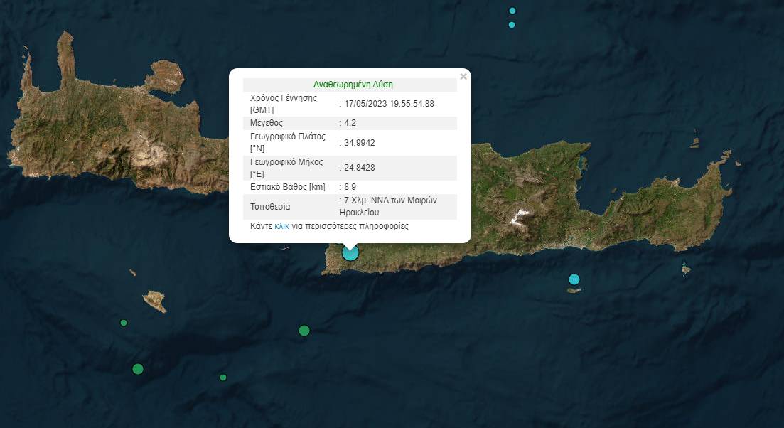 Το εστιακό βάθος ήταν στα 8,9 χιλ ενώ το επίκεντρο εντοπίζεται 7 χλμ, νότια νοτιοδυτικά των Μοιρών Ηρακλείου