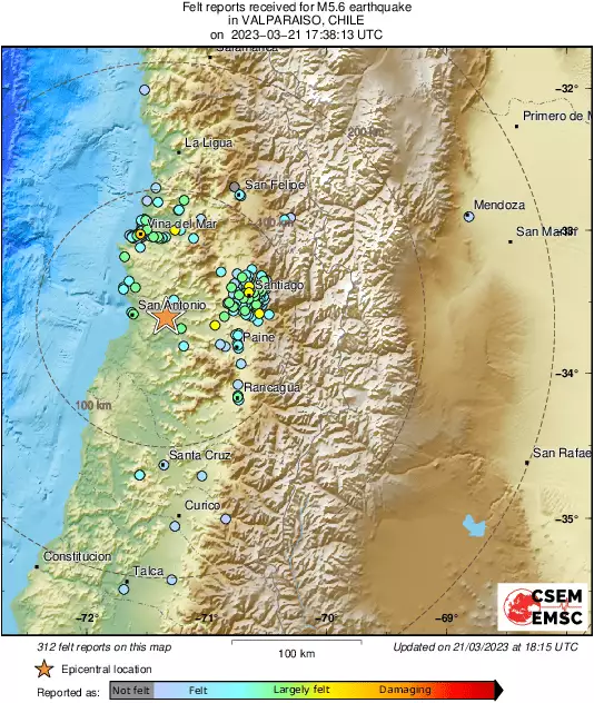Σεισμική δόνηση μεγέθους 5,6 Ρίχτερ έγινε στις 19.38 ώρα Ελλάδας (14.38 ώρα Χιλής) 15 χιλιόμετρα από την Μελιπίγια, σύμφωνα με το Ευρωμεσογειακό Σεισμολογικό Κέντρο.