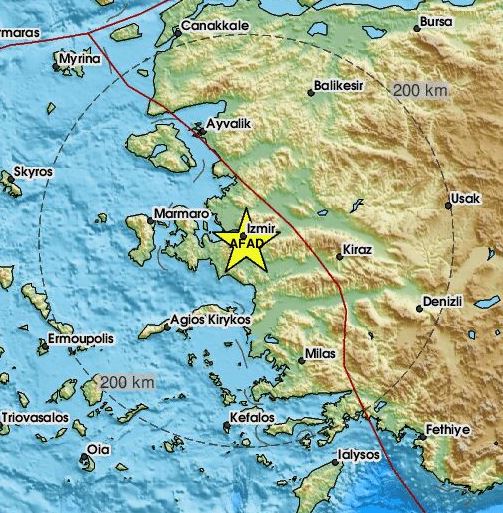 Το εστιακό βάθος της σεισμικής δόνησης εντοπίζεται στα 7 χιλιόμετρα και το επίκεντρο στα 9 χιλιόμετρα από τη Σμύρνη, σύμφωνα με το Ευρωμεσογειακό Κέντρο