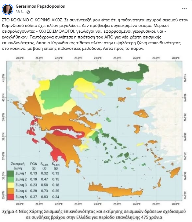 Ο Γεράσιμος Παπαδόπουλος με νέα του ανάρτηση στα μέσα κοινωνικής δικτύωσης το πρωί της Κυριακής (26/4) αναφέρθηκε στον επικείμενο σεισμό στον Κορινθιακό Κόλπο έπειτα από τις αντιδράσεις άλλων επιστημόνων.