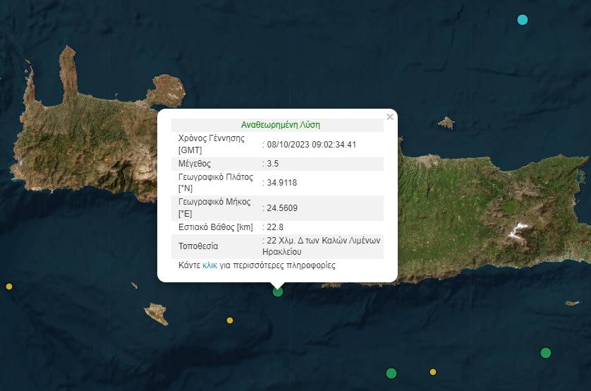 H νέα σεισμική δόνηση σημειώθηκε στις 12:02 είχε και αυτή μέγεθος 3,5 Ρίχτερ με επίκεντρο 22 χιλιόμετρα δυτικά των Καλών Λιμένων Ηρακλείου.