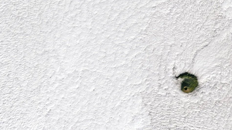 Στη δορυφορική φωτογραφία που τράβηξε το 2022 διαστημικό σκάφος σε τροχιά διακρίνεται η καλδέρα του Βεζούβιου – η ηφαιστειακή κοιλότητα που σχηματίστηκε όταν υποχώρησε μέρος του ηφαιστειακού κώνου σε προηγούμενη έκρηξη – να ξεπροβάλει σαν γιγάντιο μάτι μέσα από τα σύννεφα.
