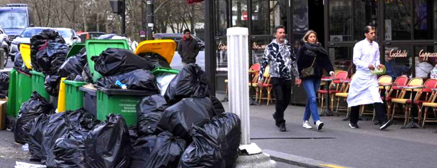 Οι επισκέπτες που θέλουν να θαυμάσουν τον Πύργο του Άιφελ μέσα από την εσπλανάντ του Τροκαντερό βγαίνοντας από το μετρό πέφτουν επάνω σε έναν τοίχο από μαύρες σακούλες. Στο κέντρο της πόλης, τα άλλοτε ρομαντικά δρομάκια είναι σπαρμένα με κούτες, καφάσια, αποφάγια…