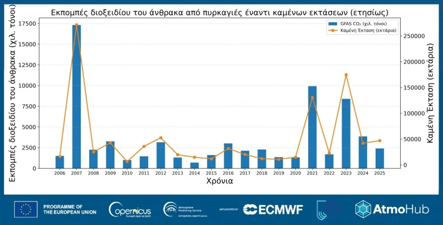 Το 2025 καταγράφεται επίσης ρεκόρ καύσης δασικών εκτάσεων στην Ευρωπαϊκή Ένωση, με περισσότερα από 10 εκατ. στρέμματα, ενώ οι εκπομπές CO2 από πυρκαγιές φτάνουν τα υψηλότερα επίπεδα των τελευταίων 23 ετών, σύμφωνα με την υπηρεσία Copernicus CAMS.