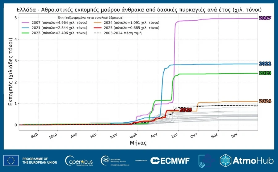 Στην Ελλάδα, οι εκπομπές μαύρου άνθρακα φτάνουν τους 685 τόνους μέχρι τα τέλη Αυγούστου, στο μέσο όρο των ετών 2003-2024.