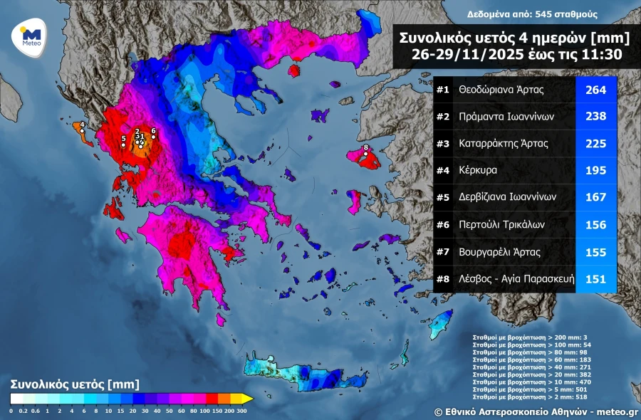 Επιπλέον, 3 σταθμοί στην Ήπειρο και πιο συγκεκριμένα στα Τζουμέρκα, κατέγραψαν πάνω από 200 χιλιοστά, επιβαρύνοντας ακόμη περισσότερο την ήδη δύσκολη κατάσταση στην περιοχή.