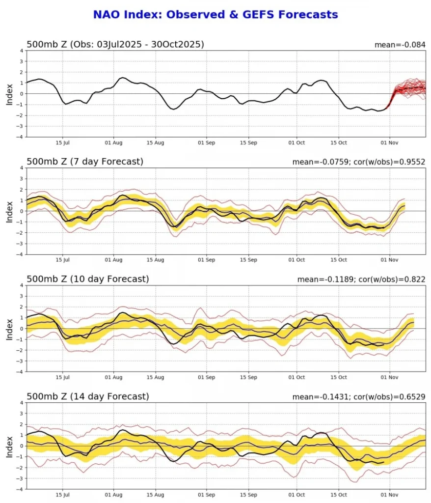 Κύριο αίτιο της καιρικής κατάστασης είναι η έντονη ροή βαρομετρικών συστημάτων στον βόρειο Ατλαντικό (όπως έγραψα πριν λίγες ημέρες) και το μαρτυρά ο δείκτης (ΝΑΟ) τα Ισλανδικά β.χαμηλά να επικρατούν για το επόμενο δεκαήμερο.