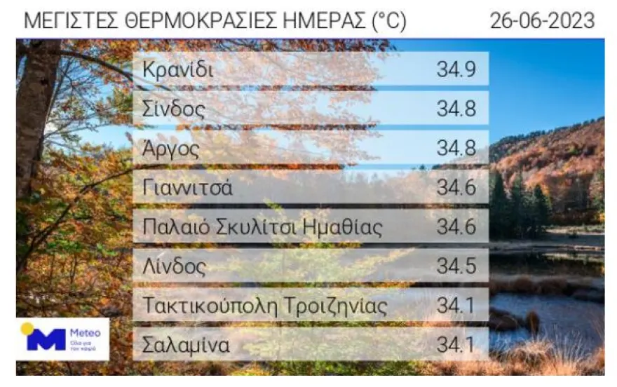Στον σχετικό πίνακα παρουσιάζονται οι 8 σταθμοί του δικτύου που κατέγραψαν τις υψηλότερες θερμοκρασίες σήμερα.