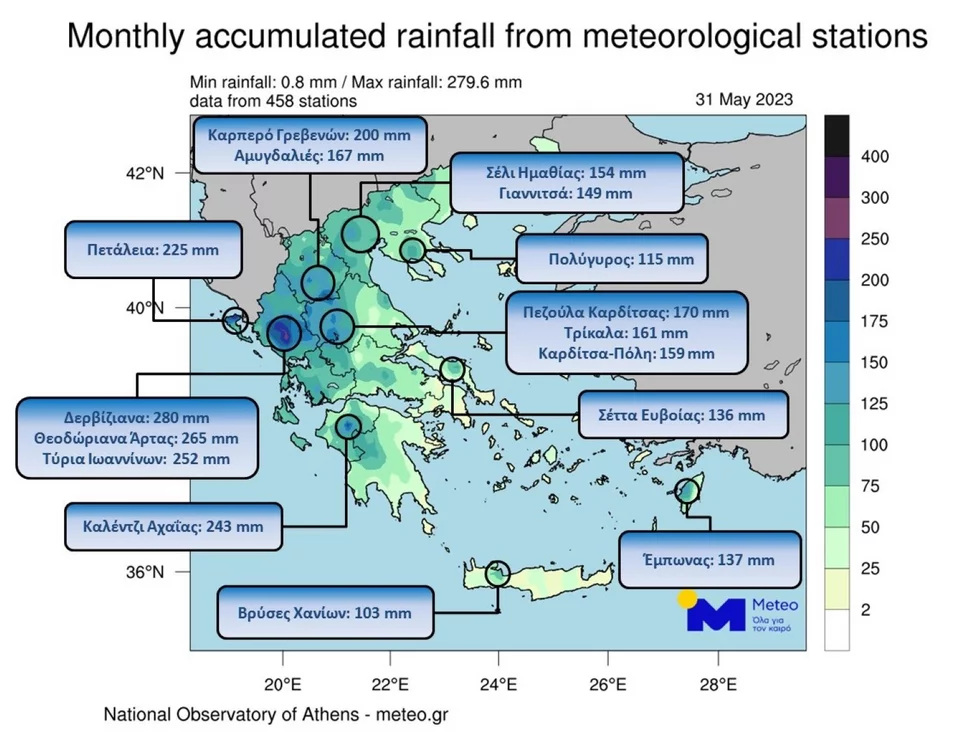 Όπως αναφέρει, μετά από έναν φτωχό υετικά χειμώνα και μια σχετικά άνυδρη άνοιξη για το μεγαλύτερο μέρος της χώρας (με εξαίρεση τα δυτικά), ο Μάιος του 2023 παρουσίασε ένα εξαιρετικά βροχερό πρόσωπο.