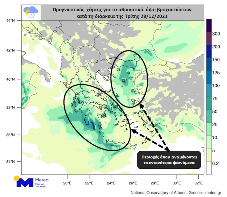 Στο προγνωστικό χάρτη που ακολουθεί παρουσιάζεται η γεωγραφική κατανομή του αθροιστικού υετού (βροχές/καταιγίδες) έως το τέλος του 24ώρου, σύμφωνα με το προγνωστικό μοντέλο του Εθνικού Αστεροσκοπείου Αθηνών.